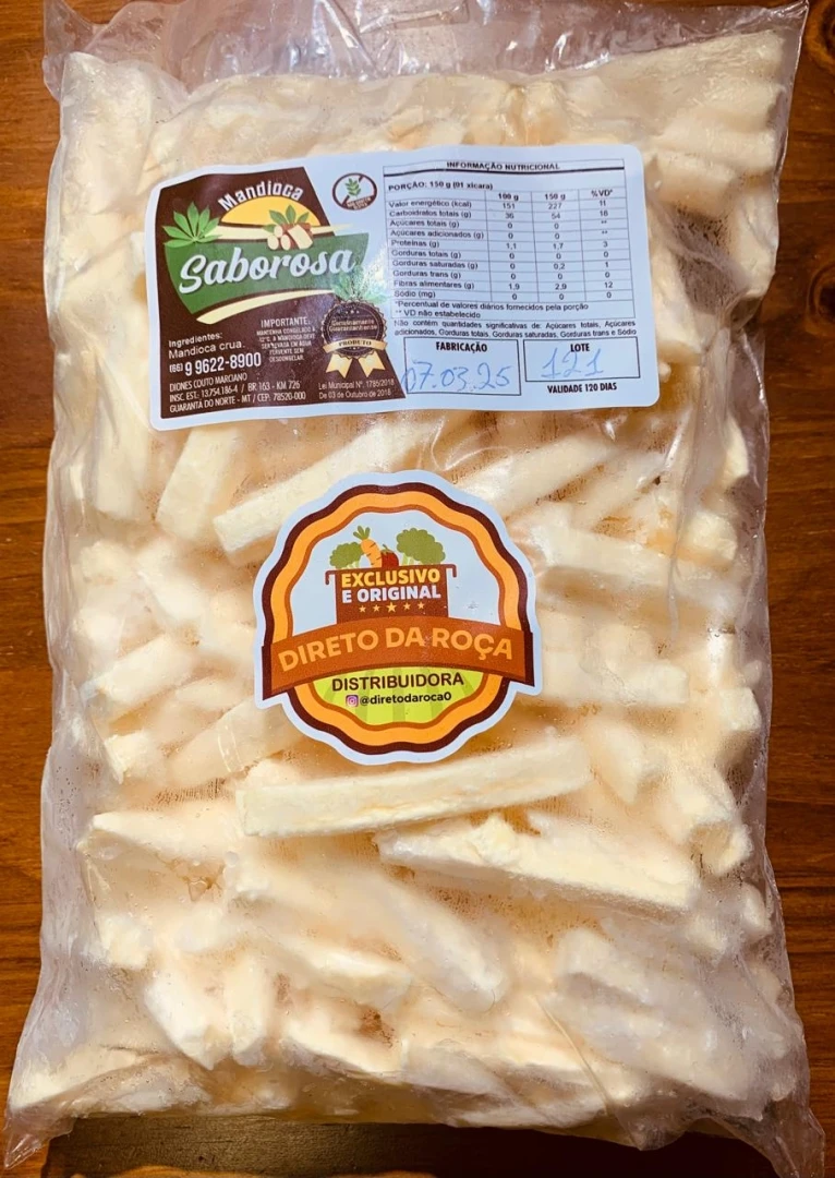 Mandioca preparada para fritura, cortes em palito, não precisa cozinhar do pacote direto para fritura. ESTE PRODUTO NÃO É, E NÃO TEM O MESMO SABOR DE BATATINHA!